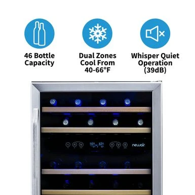 This compressor-cooled unit holds up to 46 bottles of wine in two separate zones. With temperatures that go all the way down to 40 degrees Fahrenheit, this wine cooler offers the perfect serving temperature for your favorite vintages.