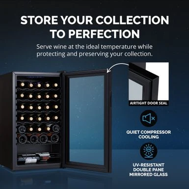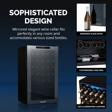 ย After a long day, theres nothing better than the company of good friends, good food, and a great glass of wine. The Newair Shadow Series 34 Bottle Wine Fridge lets you enjoy the finer things in lifeand looks great doing it. The sleek, updated design features a mirrored glass door that blends perfectly into your dcor while resisting smudges and fingerprints. The double pane glass blocks harmful UV rays to protect your wines flavor and aroma. The durable control panel is built right into the glass, allowing you to select the perfect temperature with ease. Its never been easieror more stylishto serve up your favorite vintage. ย